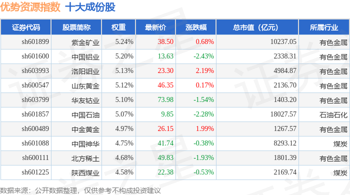 优势资源(000145)指数十大成份股详情如下: