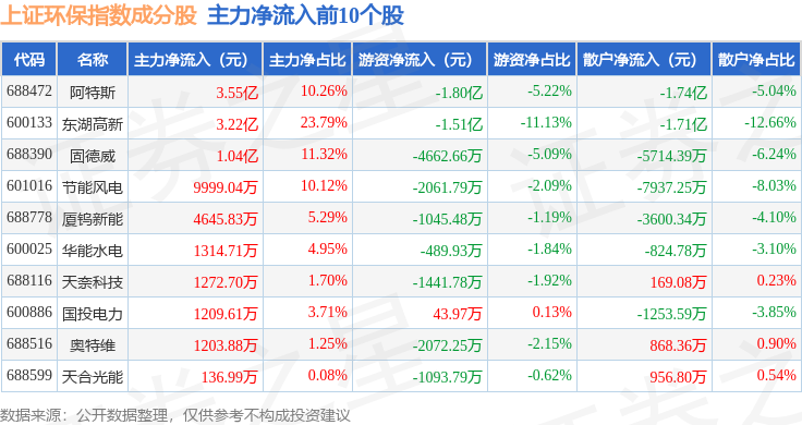 资金流向方面,上证环保(000158)指数成份股当日主力资金净流出合计71.76亿元,游资资金净流入合计22.19亿元,散户资金净流入合计49.58亿元。成份股资金流向详情见下表: