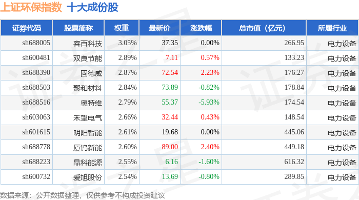 证券之星消息,1月14日,上证环保(000158)指数报收于1390.43点,涨0.19%,成交691.41亿元,换手率2.1%。当日该指数成份股中,上涨的有17家,东湖高新以10.05%的涨幅领涨,下跌的有20家,奥特维以5.93%的跌幅领跌。