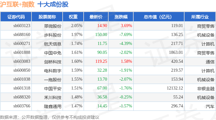 证券之星消息,1月14日,沪互联+(000162)指数报收于3995.01点,涨1.32%,成交1186.58亿元,换手率2.64%。当日该指数成份股中,上涨的有47家,金桥信息以10.02%的涨幅领涨,下跌的有24家,步科股份以7.69%的跌幅领跌。