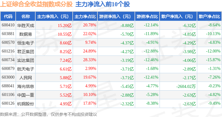 资金流向方面,上证综合全收益(000888)指数成份股当日主力资金净流出合计474.08亿元,游资资金净流入合计77.74亿元,散户资金净流入合计396.34亿元。成份股资金流向详情见下表: