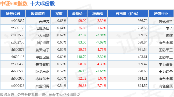 中证500(000905)指数十大成份股详情如下:
