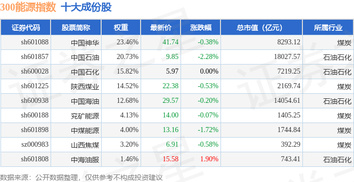证券之星消息,1月14日,300能源(000908)指数报收于2374.18点,跌0.72%,成交110.07亿元,换手率0.29%。当日该指数成份股中,上涨的有1家,中海油服以1.9%的涨幅领涨,下跌的有7家,中国石油以2.28%的跌幅领跌。