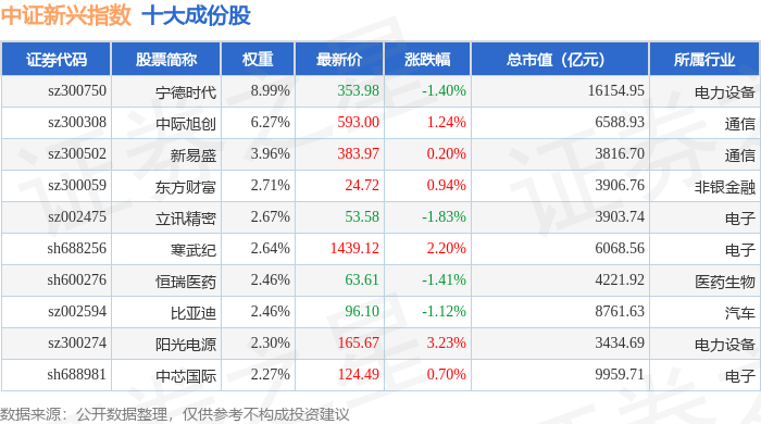 证券之星消息,1月14日,中证新兴(000964)指数报收于11462.37点,涨0.12%,成交5263.25亿元,换手率3.06%。当日该指数成份股中,上涨的有45家,海光信息以6.76%的涨幅领涨,下跌的有54家,中国卫通以10.0%的跌幅领跌。