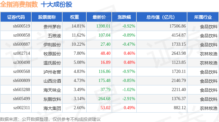 全指消费(000990)指数十大成份股详情如下:
