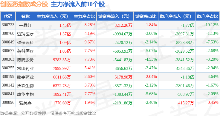 资金流向方面,创医药(399275)指数成份股当日主力资金净流出合计8.31亿元,游资资金净流入合计1.33亿元,散户资金净流入合计6.98亿元。成份股资金流向详情见下表: