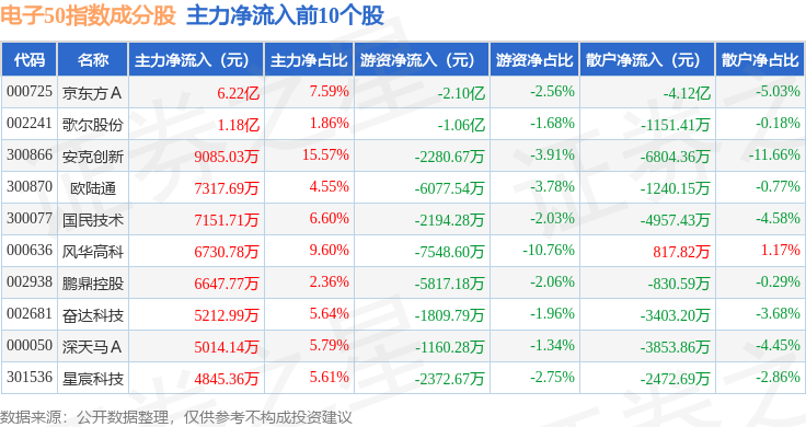 资金流向方面,电子50(399281)指数成份股当日主力资金净流出合计48.42亿元,游资资金净流入合计7.9亿元,散户资金净流入合计40.53亿元。成份股资金流向详情见下表: