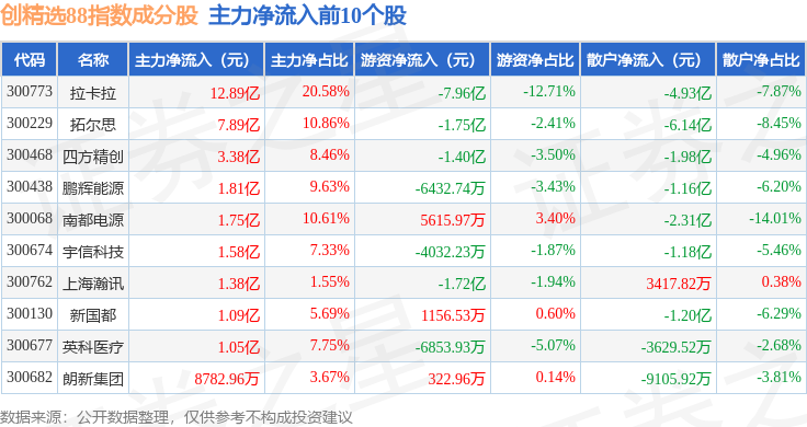 资金流向方面,创精选88(399291)指数成份股当日主力资金净流出合计9052.96万元,游资资金净流出合计11.48亿元,散户资金净流入合计12.39亿元。成份股资金流向详情见下表: