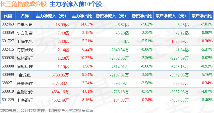 资金流向方面,长三角(399355)指数成份股当日主力资金净流出合计36.41亿元,游资资金净流入合计8.29亿元,散户资金净流入合计28.12亿元。成份股资金流向详情见下表: