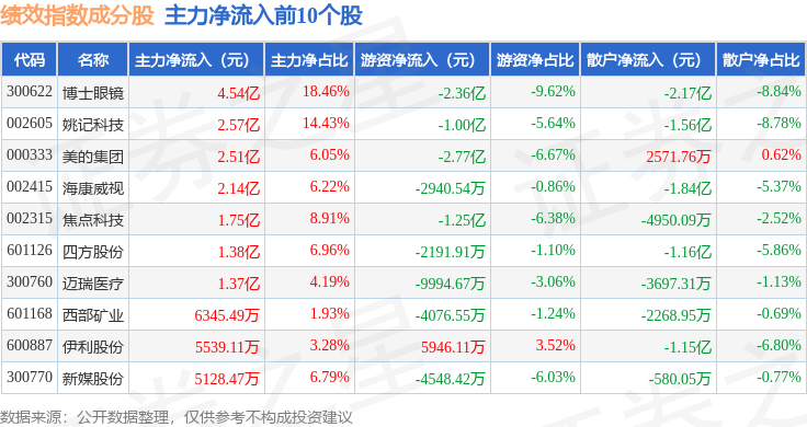 资金流向方面,绩效指数(399398)成份股当日主力资金净流出合计33.48亿元,游资资金净流入合计16.73亿元,散户资金净流入合计16.75亿元。成份股资金流向详情见下表: