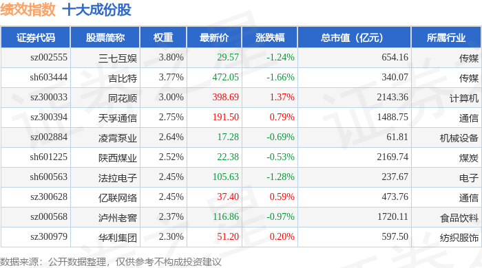 绩效指数(399398)十大成份股详情如下: