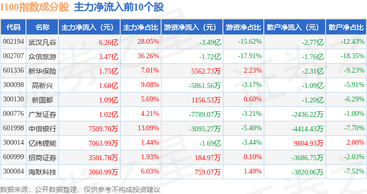 资金流向方面,I100(399415)指数成份股当日主力资金净流出合计57.16亿元,游资资金净流入合计16.36亿元,散户资金净流入合计40.81亿元。成份股资金流向详情见下表:
