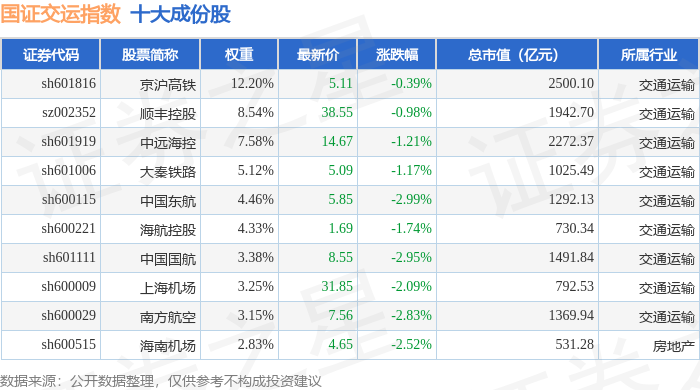 国证交运(399433)指数十大成份股详情如下: