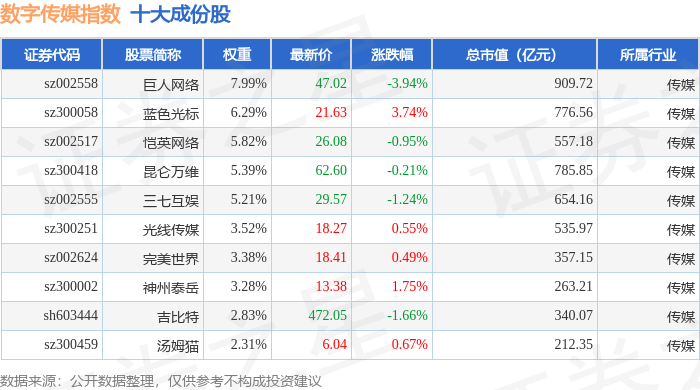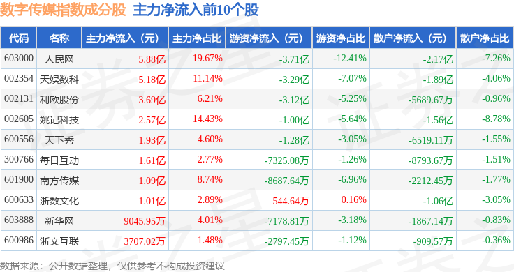 资金流向方面,数字传媒(399434)指数成份股当日主力资金净流出合计42.86亿元,游资资金净流入合计1.78亿元,散户资金净流入合计41.08亿元。成份股资金流向详情见下表:
