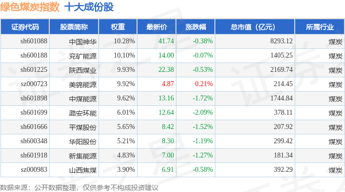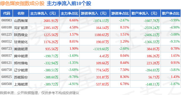 资金流向方面,绿色煤炭(399436)指数成份股当日主力资金净流出合计2.59亿元,游资资金净流入合计2.62亿元,散户资金净流出合计304.22万元。成份股资金流向详情见下表: