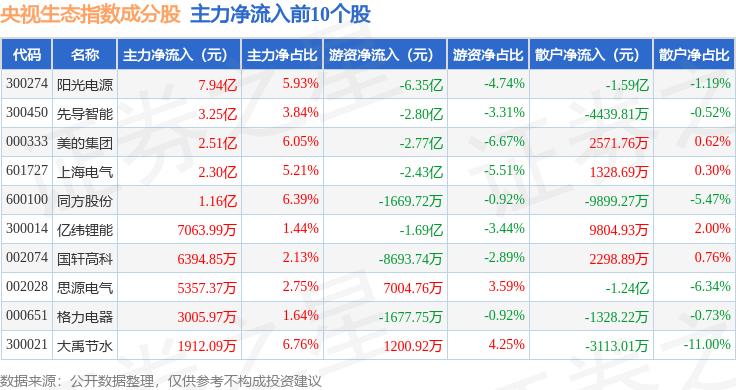 资金流向方面,央视生态(399556)指数成份股当日主力资金净流出合计63.93亿元,游资资金净流入合计5.54亿元,散户资金净流入合计58.39亿元。成份股资金流向详情见下表: