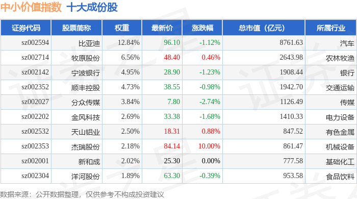 证券之星消息,1月14日,中小价值(399604)指数报收于2129.0点,跌0.03%,成交931.79亿元,换手率2.14%。当日该指数成份股中,上涨的有39家,华邦健康以10.1%的涨幅领涨,下跌的有57家,华明装备以4.84%的跌幅领跌。