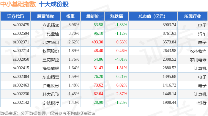 中小基础(399623)指数十大成份股详情如下: