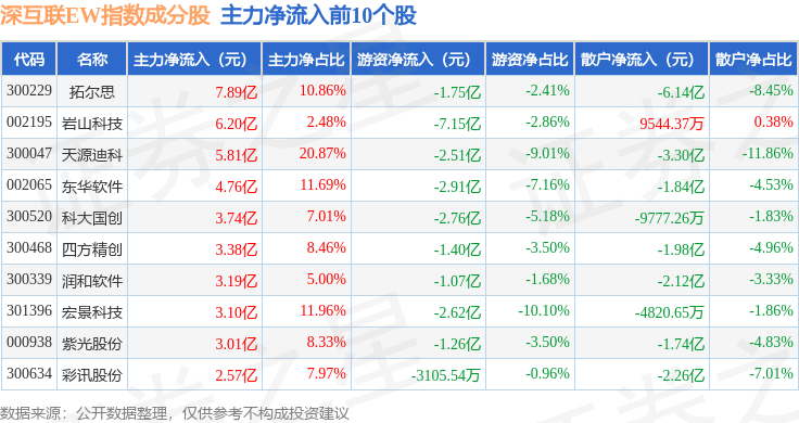 资金流向方面,深互联EW(399677)指数成份股当日主力资金净流入合计16.61亿元,游资资金净流出合计29.26亿元,散户资金净流入合计12.64亿元。成份股资金流向详情见下表: