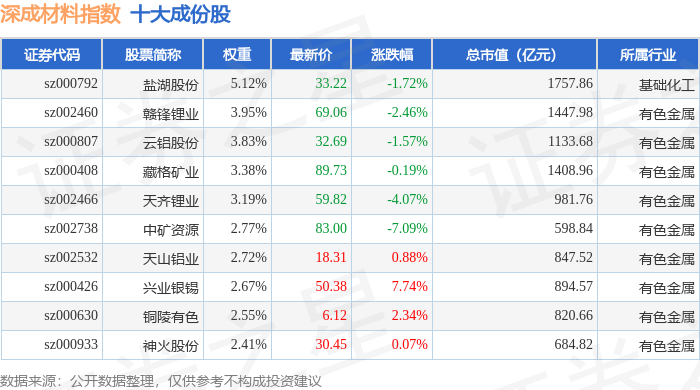 证券之星消息,1月14日,深成材料(399681)指数报收于1412.73点,涨0.08%,成交1121.34亿元,换手率2.7%。当日该指数成份股中,上涨的有41家,锡业股份以8.61%的涨幅领涨,下跌的有35家,国城矿业以7.15%的跌幅领跌。