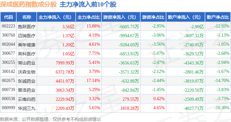 资金流向方面,深成医药(399685)指数成份股当日主力资金净流入合计9371.77万元,游资资金净流出合计4.0亿元,散户资金净流入合计3.06亿元。成份股资金流向详情见下表: