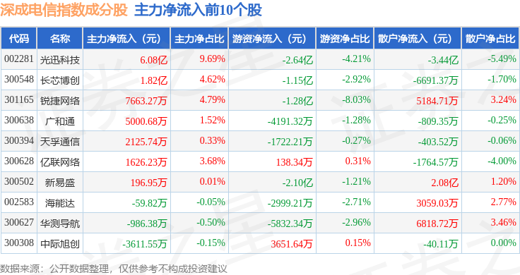 资金流向方面,深成电信(399688)指数成份股当日主力资金净流出合计14.97亿元,游资资金净流出合计3.27亿元,散户资金净流入合计18.24亿元。成份股资金流向详情见下表: