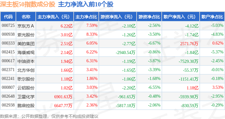 资金流向方面,深主板50(399750)指数成份股当日主力资金净流出合计25.97亿元,游资资金净流入合计2.42亿元,散户资金净流入合计23.55亿元。成份股资金流向详情见下表: