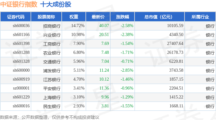证券之星消息,1月14日,中证银行(399986)指数报收于7385.95点,跌1.91%,成交426.83亿元,换手率0.39%。当日该指数成份股中,下跌的有41家,浦发银行以2.85%的跌幅领跌。