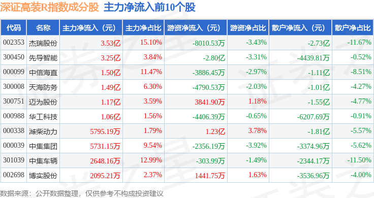资金流向方面,深证高装R(470037)指数成份股当日主力资金净流出合计40.48亿元,游资资金净流入合计8831.6万元,散户资金净流入合计39.6亿元。成份股资金流向详情见下表: