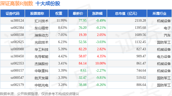 证券之星消息,1月14日,深证高装R(470037)指数报收于3770.99点,跌0.36%,成交1126.91亿元,换手率5.86%。当日该指数成份股中,上涨的有16家,杰瑞股份以10.0%的涨幅领涨,下跌的有33家,航天发展以9.81%的跌幅领跌。