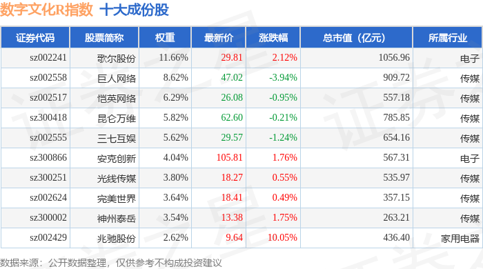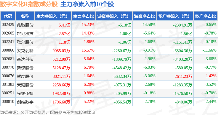 资金流向方面,数字文化R(470047)指数成份股当日主力资金净流出合计29.77亿元,游资资金净流出合计1491.28万元,散户资金净流入合计29.91亿元。成份股资金流向详情见下表: