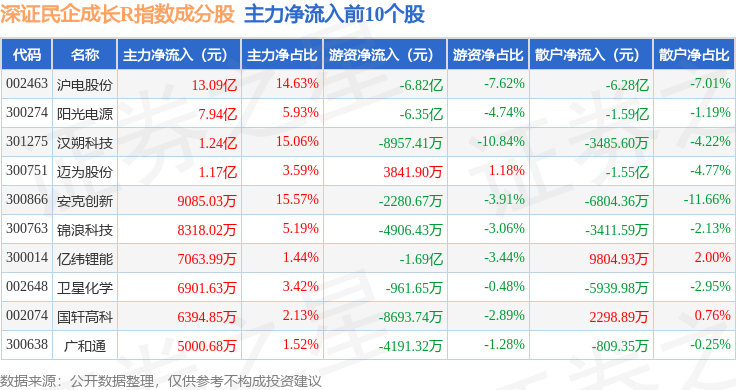 资金流向方面,深证民企成长R(470071)指数成份股当日主力资金净流出合计29.48亿元,游资资金净流出合计3.56亿元,散户资金净流入合计33.05亿元。成份股资金流向详情见下表: