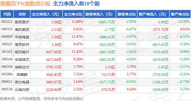 资金流向方面,规模因子R(480055)指数成份股当日主力资金净流出合计6.24亿元,游资资金净流入合计2.77亿元,散户资金净流入合计3.47亿元。成份股资金流向详情见下表: