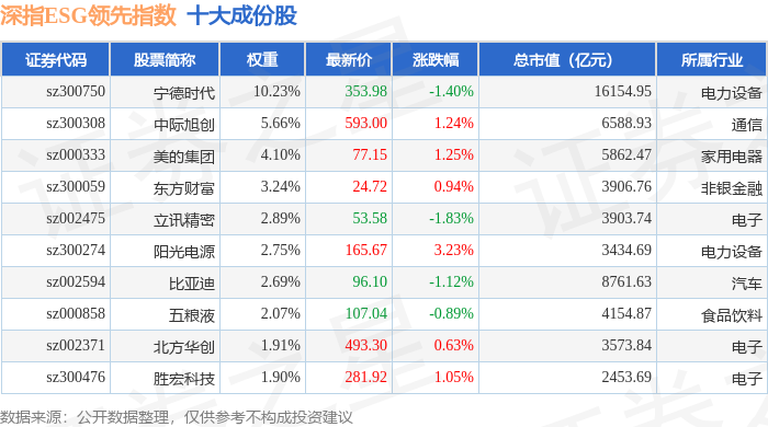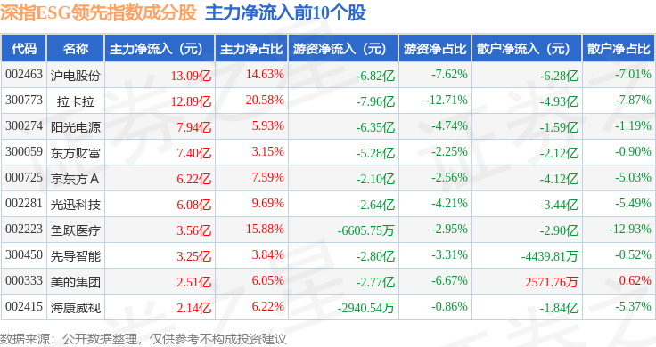 资金流向方面,深指ESG领先(970029)指数成份股当日主力资金净流出合计97.04亿元,游资资金净流出合计13.13亿元,散户资金净流入合计110.17亿元。成份股资金流向详情见下表: