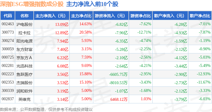 资金流向方面,深指ESG增强(970032)指数成份股当日主力资金净流出合计68.55亿元,游资资金净流出合计17.69亿元,散户资金净流入合计86.24亿元。成份股资金流向详情见下表: