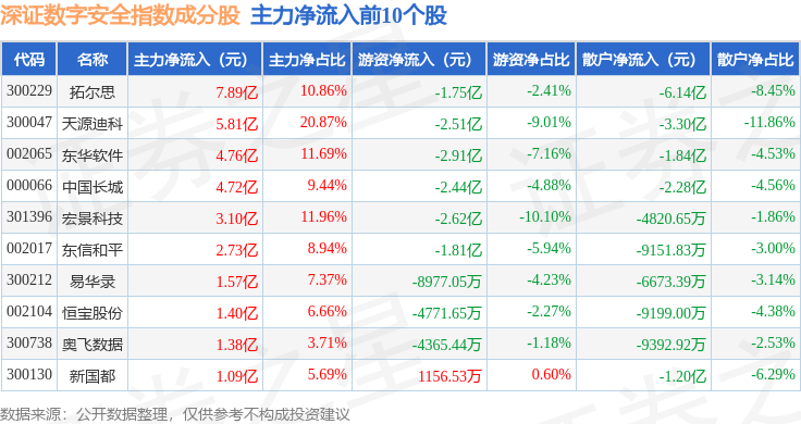 资金流向方面,深证数字安全(970052)指数成份股当日主力资金净流入合计24.89亿元,游资资金净流出合计19.35亿元,散户资金净流出合计5.53亿元。成份股资金流向详情见下表: