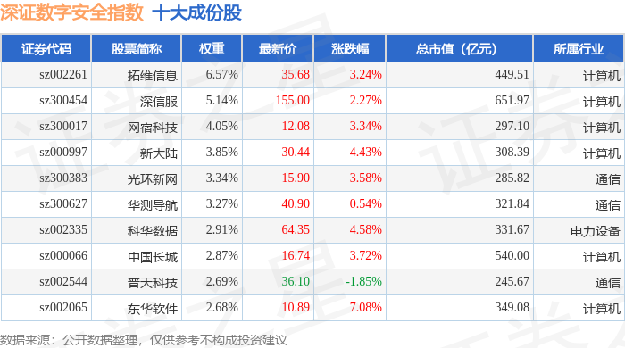 证券之星消息,1月14日,深证数字安全(970052)指数报收于3936.31点,涨3.55%,成交978.53亿元,换手率11.21%。当日该指数成份股中,上涨的有45家,宏景科技以20.0%的涨幅领涨,下跌的有5家,信息发展以4.14%的跌幅领跌。