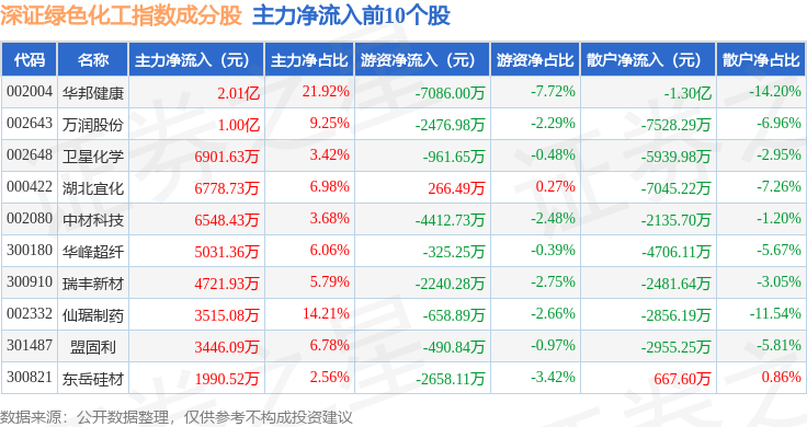 资金流向方面,深证绿色化工(970076)指数成份股当日主力资金净流出合计33.79亿元,游资资金净流入合计4.63亿元,散户资金净流入合计29.16亿元。成份股资金流向详情见下表: