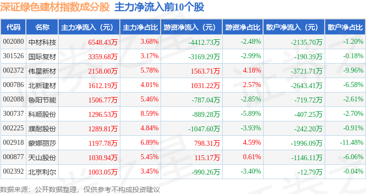 资金流向方面,深证绿色建材(970077)指数成份股当日主力资金净流入合计6319.72万元,游资资金净流出合计3117.67万元,散户资金净流出合计3202.04万元。成份股资金流向详情见下表: