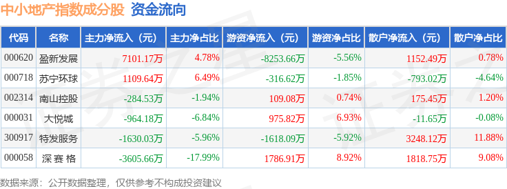 资金流向方面,中小地产(971002)指数成份股当日主力资金净流入合计1726.41万元,游资资金净流出合计7316.56万元,散户资金净流入合计5590.15万元。成份股资金流向详情见下表:
