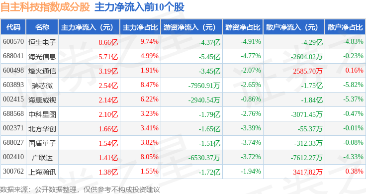 资金流向方面,自主科技(980033)指数成份股当日主力资金净流出合计2.69亿元,游资资金净流出合计19.04亿元,散户资金净流入合计21.73亿元。成份股资金流向详情见下表:
