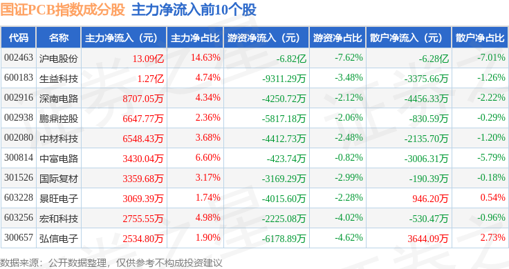 资金流向方面,国证PCB(980115)指数成份股当日主力资金净流入合计13.58亿元,游资资金净流出合计14.65亿元,散户资金净流入合计1.07亿元。成份股资金流向详情见下表: