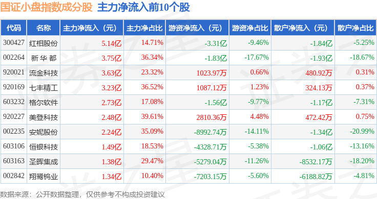 资金流向方面,国证小盘(980202)指数成份股当日主力资金净流出合计56.04亿元,游资资金净流入合计14.4亿元,散户资金净流入合计54.34亿元。成份股资金流向详情见下表: