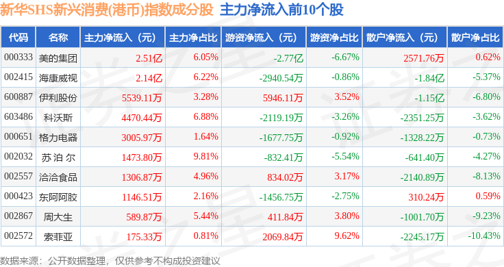 资金流向方面,新华SHS新兴消费(港币)(989007)指数成份股当日主力资金净流出合计22.84亿元,游资资金净流入合计9.66亿元,散户资金净流入合计13.18亿元。成份股资金流向详情见下表:
