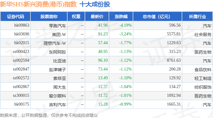 新华SHS新兴消费(港币)(989007)指数十大成份股详情如下: