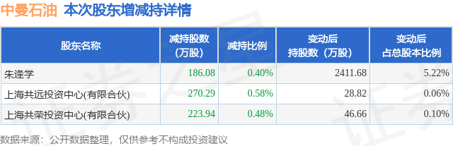 证券之星消息,1月14日中曼石油发布公告《中曼石油:中曼石油天然气集团股份有限公司关于持股5%以上的股东权益变动触及1%刻度的提示性公告》,其股东朱逢学、上海共远投资中心(有限合伙)、上海共荣投资中心(有限合伙)于2025年12月24日至2026年1月13日间合计减持680.31万股,占公司目前总股本的1.4715%,变动期间该股股价上涨13.75%,截止1月13日收盘报25.32元。