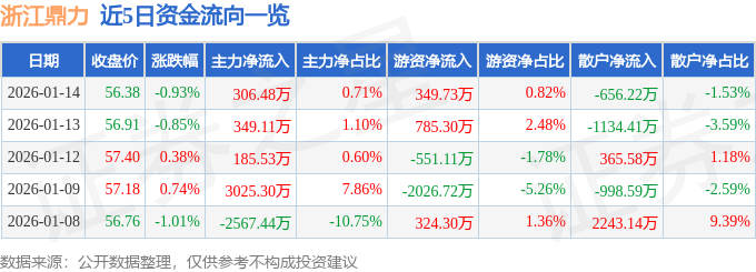 证券之星消息,截至2026年1月14日收盘,浙江鼎力(603338)报收于56.38元,下跌0.93%,换手率1.49%,成交量7.56万手,成交额4.29亿元。