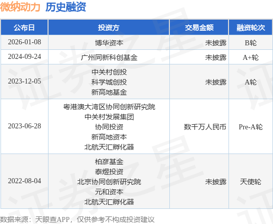 证券之星消息,根据天眼查APP于1月8日公布的信息整理,微纳动力科技(广州)有限责任公司B轮融资,融资额未披露,参与投资的机构包括博华资本。