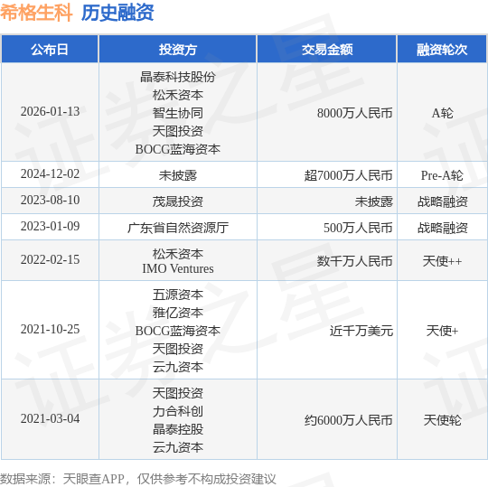 证券之星消息,根据天眼查APP于1月13日公布的信息整理,希格生科(深圳)有限公司A轮融资,融资额8000万人民币,参与投资的机构包括晶泰科技股份,松禾资本,智生协同,天图投资,BOCG蓝海资本。