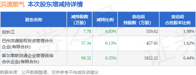 证券之星消息,1月14日洪通燃气发布公告《洪通燃气:新疆洪通燃气股份有限公司股东减持股份结果公告》,其股东刘长江、巴州洪通股权投资管理合伙企业(有限合伙)、霍尔果斯洪通企业管理咨询合伙企业(有限合伙)于2025年10月15日至2026年1月14日间合计减持144.44万股,占公司目前总股本的0.5106%,变动期间该股股价下跌21.42%,截止1月14日收盘报14.12元。